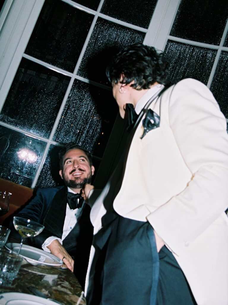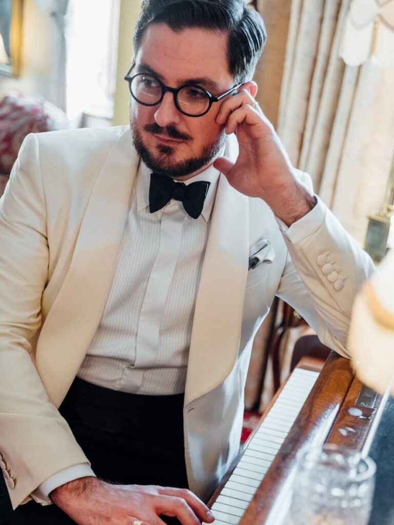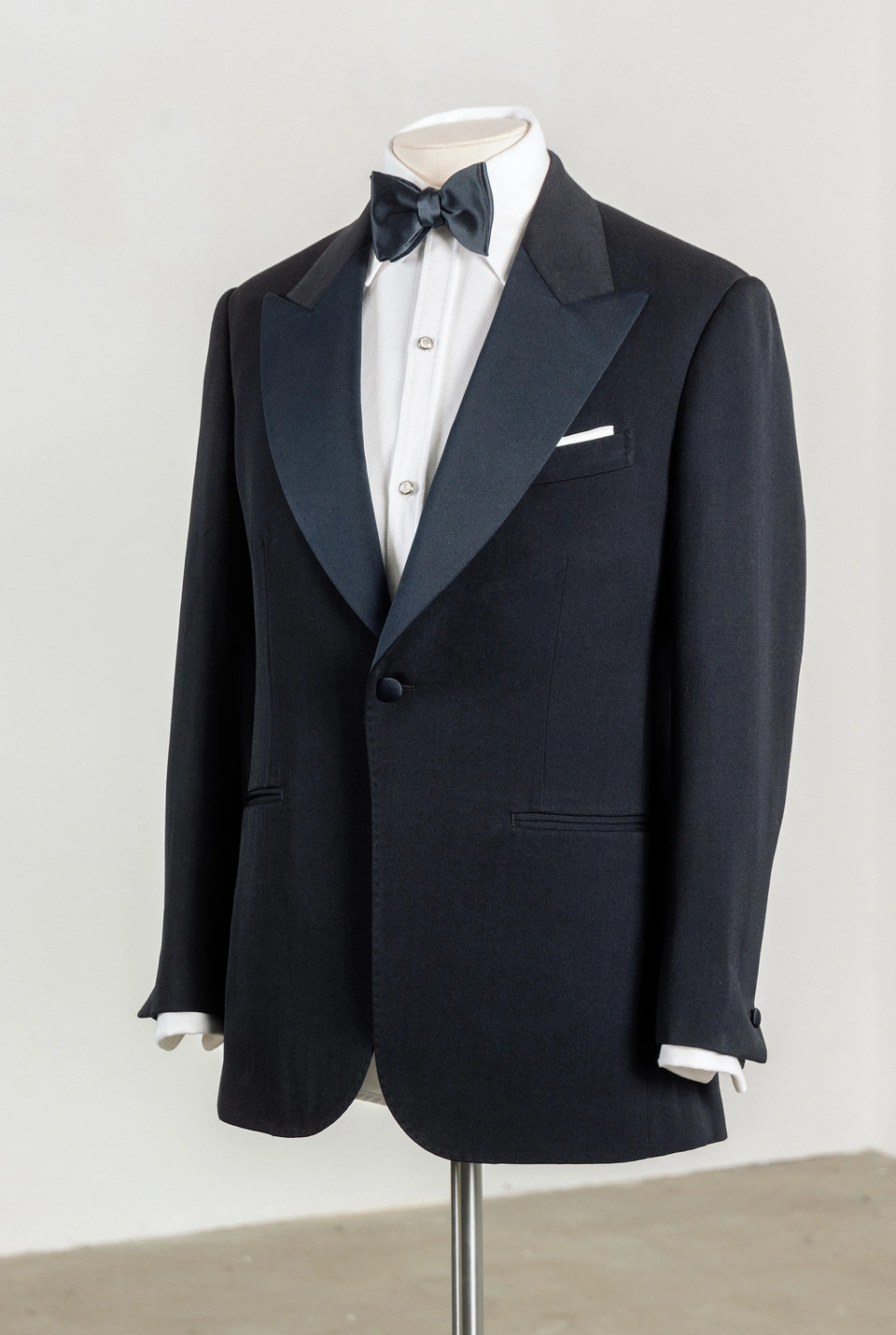 Over time, variations appeared: midnight blue (which actually looks richer than black under artificial light), ivory dinner jackets for warm climates, velvet for festive occasions. The core principles remained intact — sharp tailoring, satin contrast, bow tie precision.