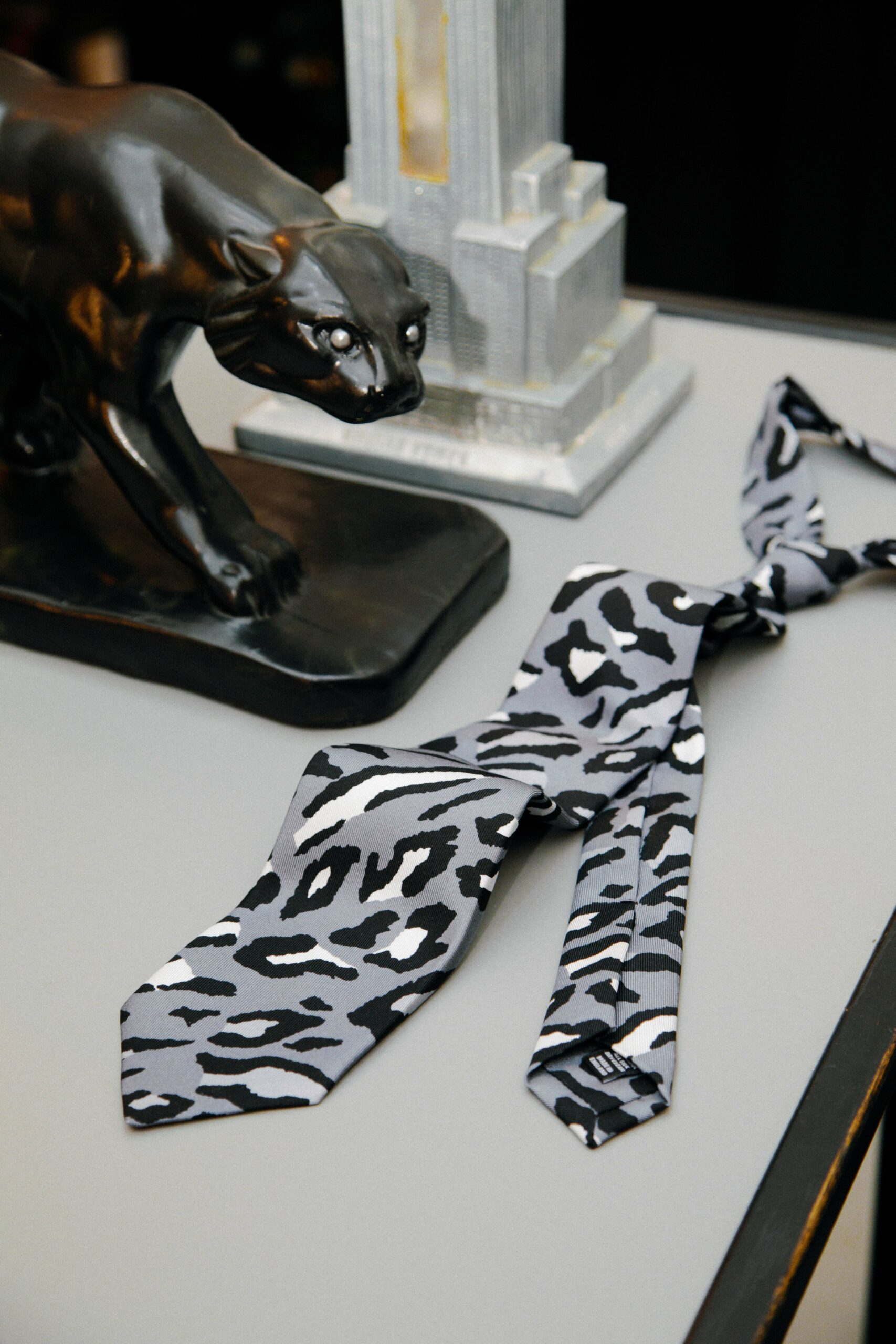 This limited edition leopard print tie was initially inspired by our customer and friend Aleks Cvetkovic posting an image on this Instagram account of Jack Nicholson wearing a kitsch leopard print tie from the movie The Departed. Mickael was quick to offer the possibility of creating a similar tie – modernising it and giving them a fun project to get their teeth into.
